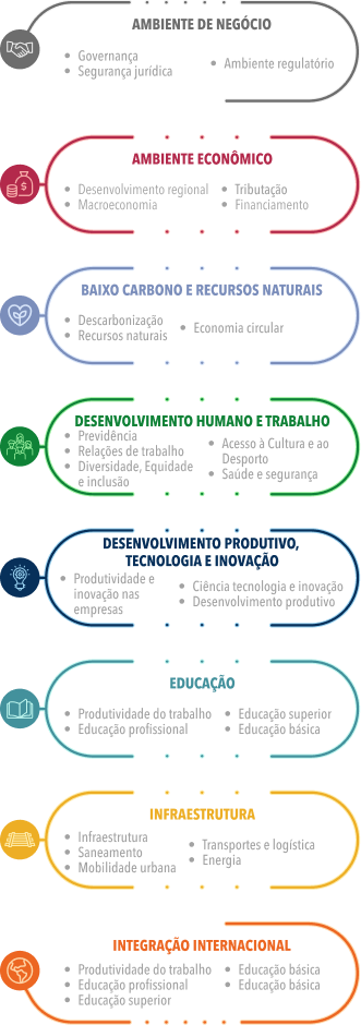 O ambiente de negócios adequado, com regulamentações claras e segurança jurídica, é a base para atrair investimentos em infraestrutura, comércio internacional e inovação. O ambiente econômico, incluindo políticas monetárias, fiscais e tributárias, influencia diretamente a capacidade de investimento e o crescimento sustentado. Além disso, a transição para uma economia de baixo carbono depende de políticas de desenvolvimento produtivo e inovação, enquanto a educação e o desenvolvimento humano são essenciais para capacitar os trabalhadores e promover a produtividade. A infraestrutura, por sua vez, é crucial para garantir a competitividade e a resiliência da indústria, enquanto a integração internacional abre oportunidades de mercado e cooperação.